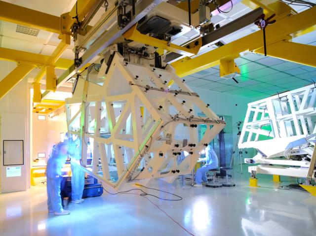 Ensuite, les SCF sont assemblés. C’est l’une des étapes critiques de fabrication, qui requiert un haut niveau de propreté. Cette opération consiste à assembler 1500 pièces dans une salle propre ISO6 de 220 m². La caractérisation et la calibration du système sont cruciales : le pointage des lasers du LMJ doit être assuré à 1 micron près, sur une cible de l’ordre du millimètre.