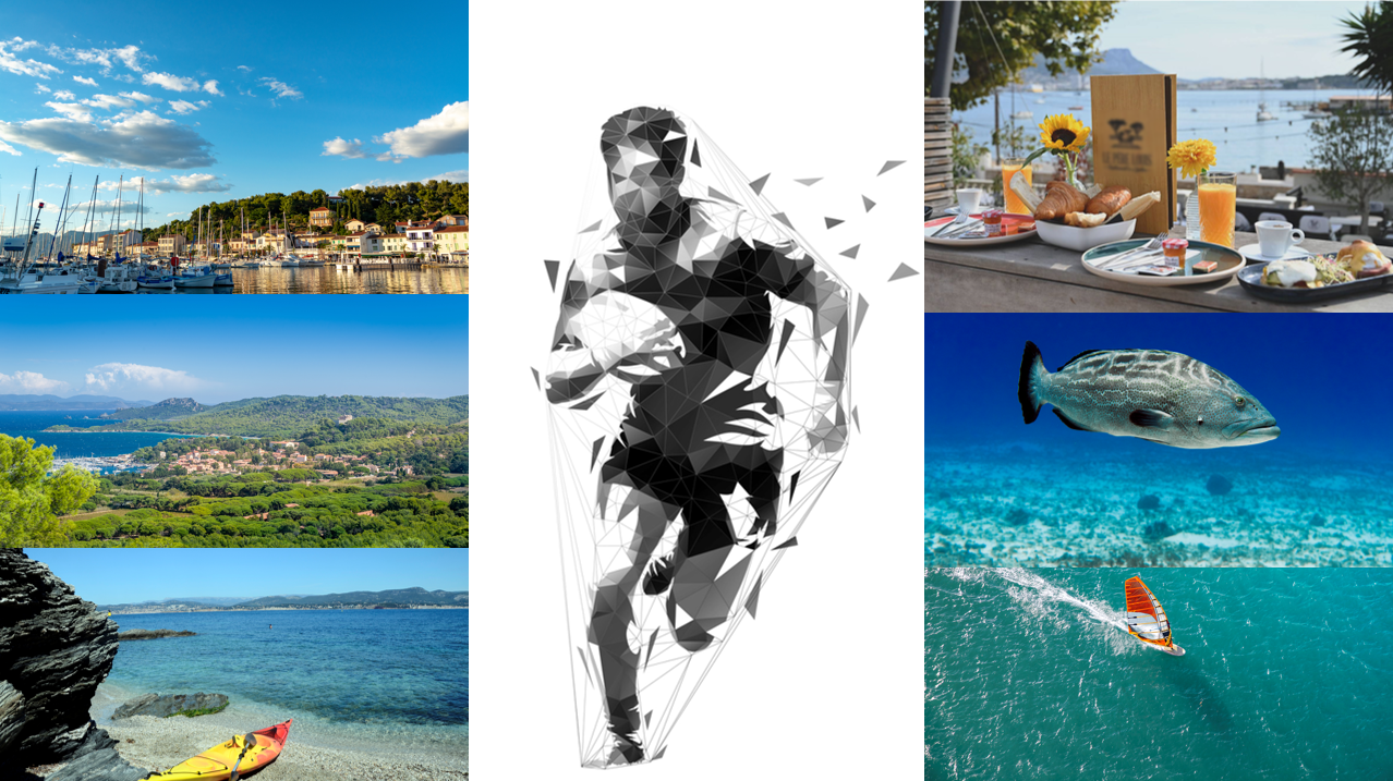 Photos (de gauche à droite et de haut en bas) : Saint Mandrier, restaurant sur la corniche de Tamaris, vieille ville et le port de plaisance de l’île de Porquerolles, mérou, Kayak de mer dans le paysage de l’île d’Embiez, planche à voile)